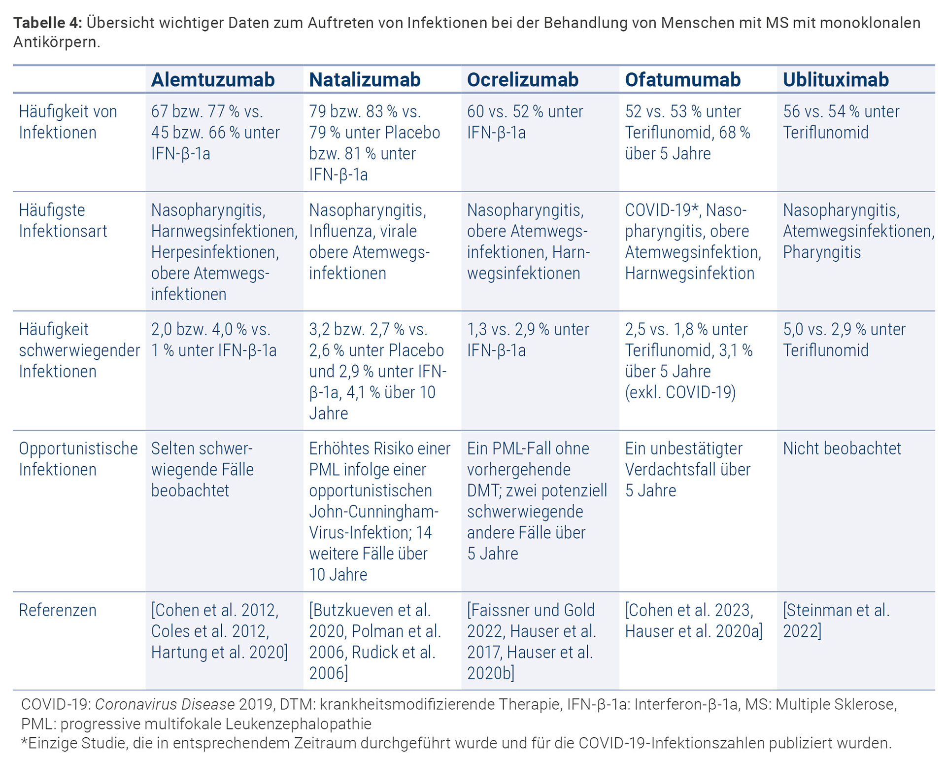 Wie bereits oben beschrieben, kann ein Eingriff in die Lymphozyten-Homöostase mit einem Risiko für Infektionen verbunden sein, sodass sich hieraus ein wichtiges Sicherheitsmerkmal der Antikörpertherapien ergibt. Tabelle 4 gibt daher eine Übersicht über die wichtigsten Daten zum Auftreten von Infektionen bei der Behandlung mit monoklonalen Antikörpern.